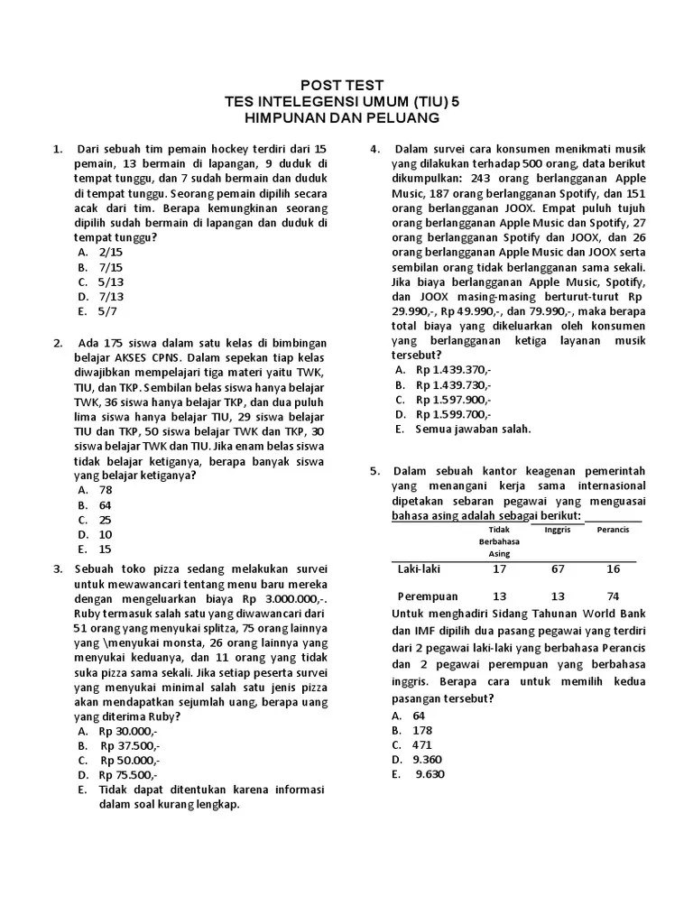 Berikut beberapa contoh soal latihan tes inteligensia umum (tiu) cpns 2019 1. Tes kompetensi dasar adalah salah satu tahap seleksi penerimaan . Ya, soal ini merupakan bagian dari materi soal tiu cpns dan tbs pppk (numerik). Peserta didik dapat mengaplikasikan pengetahuan tentang himpunan, serta dapat menggunakan nalar yang berkaitan dengan himpunan. Peluang adalah kejadian atau peristiwa merupakan himpunan bagian dari ruang . Berikut beberapa contoh soal cpns tes intelegensi umum kemampuan numerik / aritmetik, juga termasuk di dalamnya soal tiu deret angka. By icpnsposted on february 22, 2020. S a b a b b. Bangun tiga dimensi pada soal visualisasi bangun ruang terdiri dari 2 bagian. S b a s = { 1, 2, 3, 4, 5,. } a = { 1, 3, 5, 7, 11,. Contoh soal cpns matematika / irisan gabungan himpunan matematika tiu cpns soal tes cpns asn tes intelegensia umum tiu bahassoalcpns / berikut, 50 contoh . Dalam video ini dibahas tuntas 5 nomor .